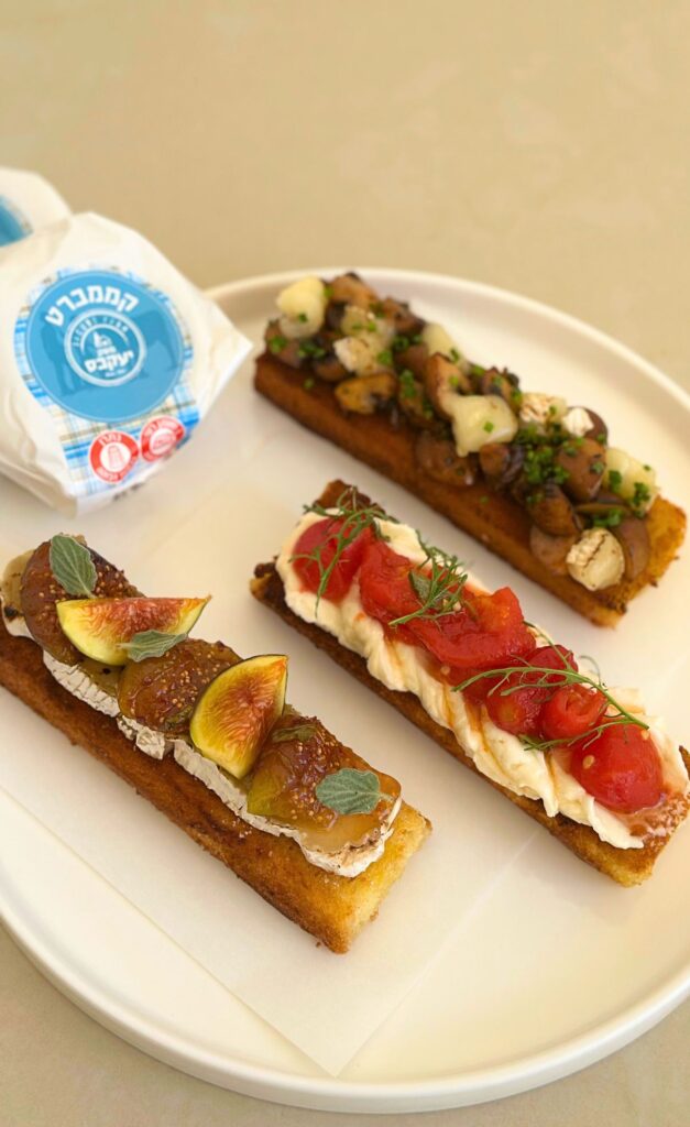 שלושה שילובים מנצחים של ברוסקטות עם גבינת קממברט בקר של משק יעקבס ומליון טעמים – מוקצפת עם ריבת עגבניות, חרוכה עם תאנים, או חמה עם פטריות