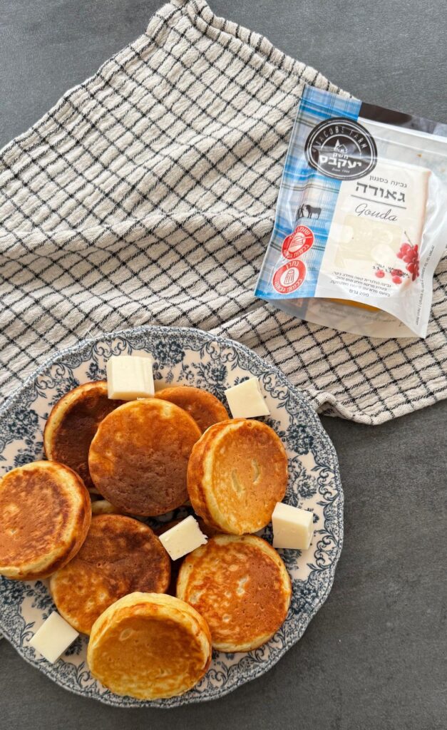 4 מטגנים במחבת פנקייקים חמה, לכל פנקייק מוסיפים קוביות גבינת גאודה וכשיש בועות קטנות הופכים.